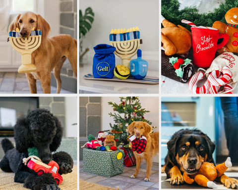 December is filled with days for celebrating, so look no further than the Paw-nukkah and Home for the Holidays Collection. If you’re celebrating Hanukkah, the Paw-nukkah collection brings the joy of the Festival of Lights to your furry friend. With playful dreidels, menorahs, and gift-giving fun, these Hanukkah dog toys will bring squeaks and crinkles galore!