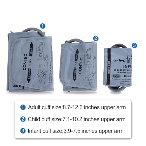 Accurate 3 Mode 3 Cuffs:The CONTEC08A Upper Arm Monitor,complete with 3 cuffs.Digital blood pressure monitors can be a household sphygmomanometer which is used for adult,pediatric and neonatal.The different size cuffs make it so perfect for assessing various person making your readings more accurate. 3 sizes of easy-wrap cuffs inflate 360° around the upper arm to help reduce measurement errors, including 8.7″-12.6″ adults cuff, 7.1″-10.2″ child cuff, 3.9″-7.5″ infant cuff.