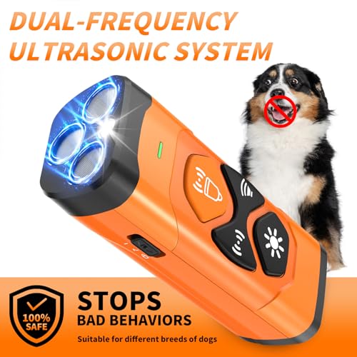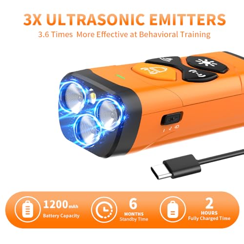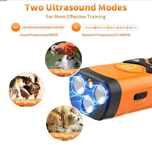 【3 Modes,1 Effective Result】:This dog bark deterrent device offers 3 different modes,each designed to achieve a single goal—to instantly capture your dog’s attention and discouraging unwanted behaviors. Does your dog bark,dig,chase,or chew? No more worries! You’ll be amazed at how quickly and painlessly your pup responds to this innovative no-bark training device.The ultrasonic feature ensures a humane and effective training experience.